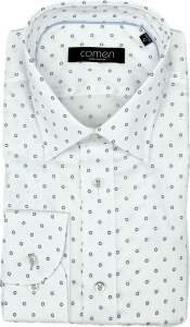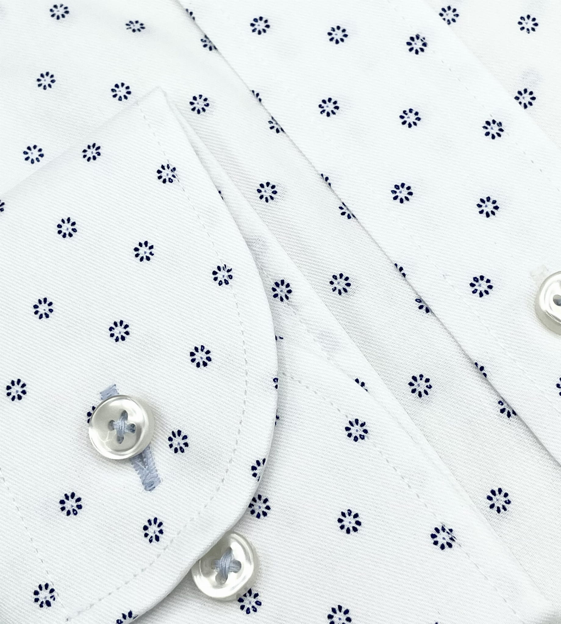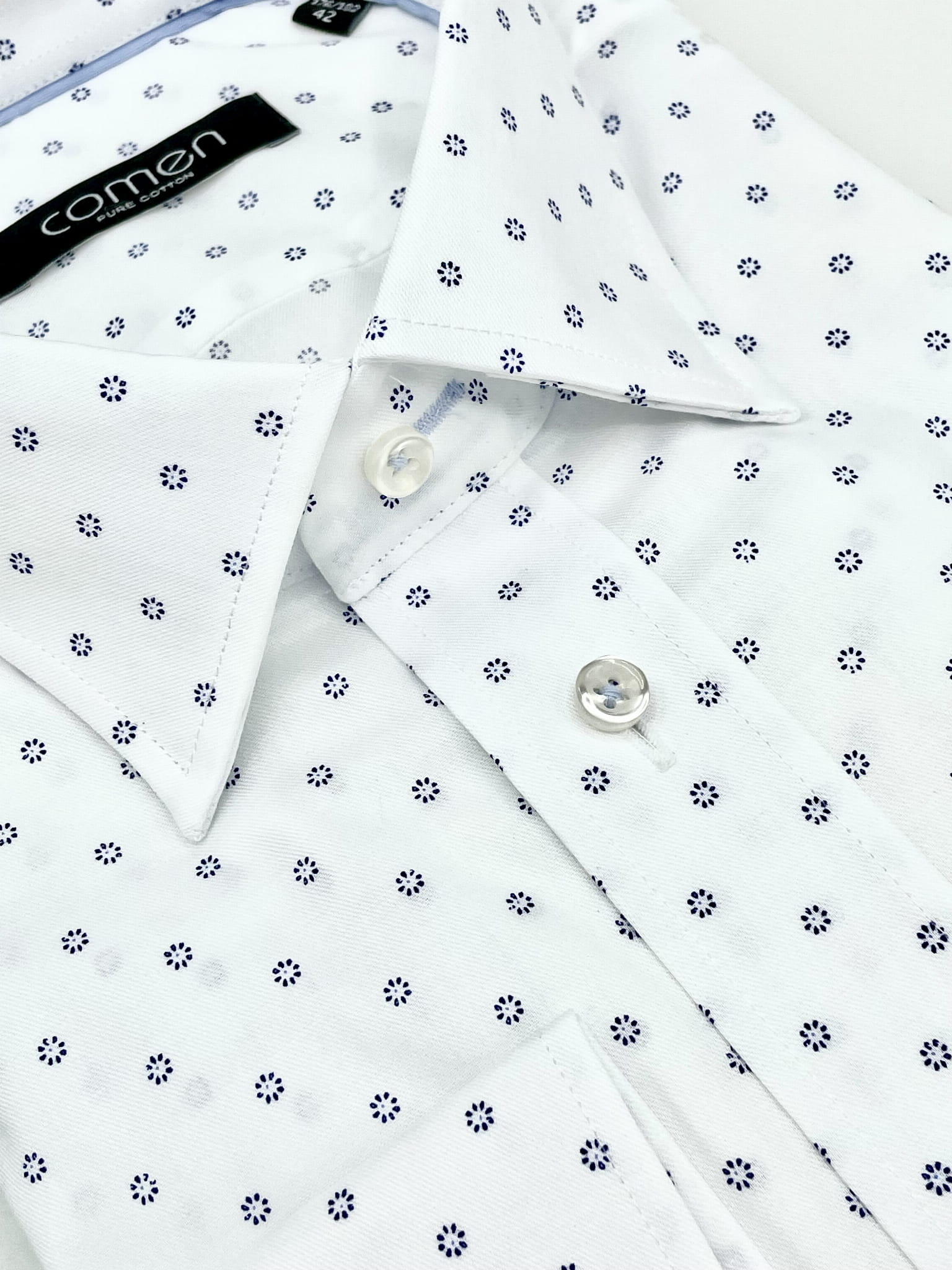Przedstawiamy naszą najnowszą koszulę męską, która emanuje subtelnością i elegancją. Ta biała koszula z subtelnym granatowym wzorem to doskonały wybór dla mężczyzn poszukujących klasyki z nutą nowoczesności.