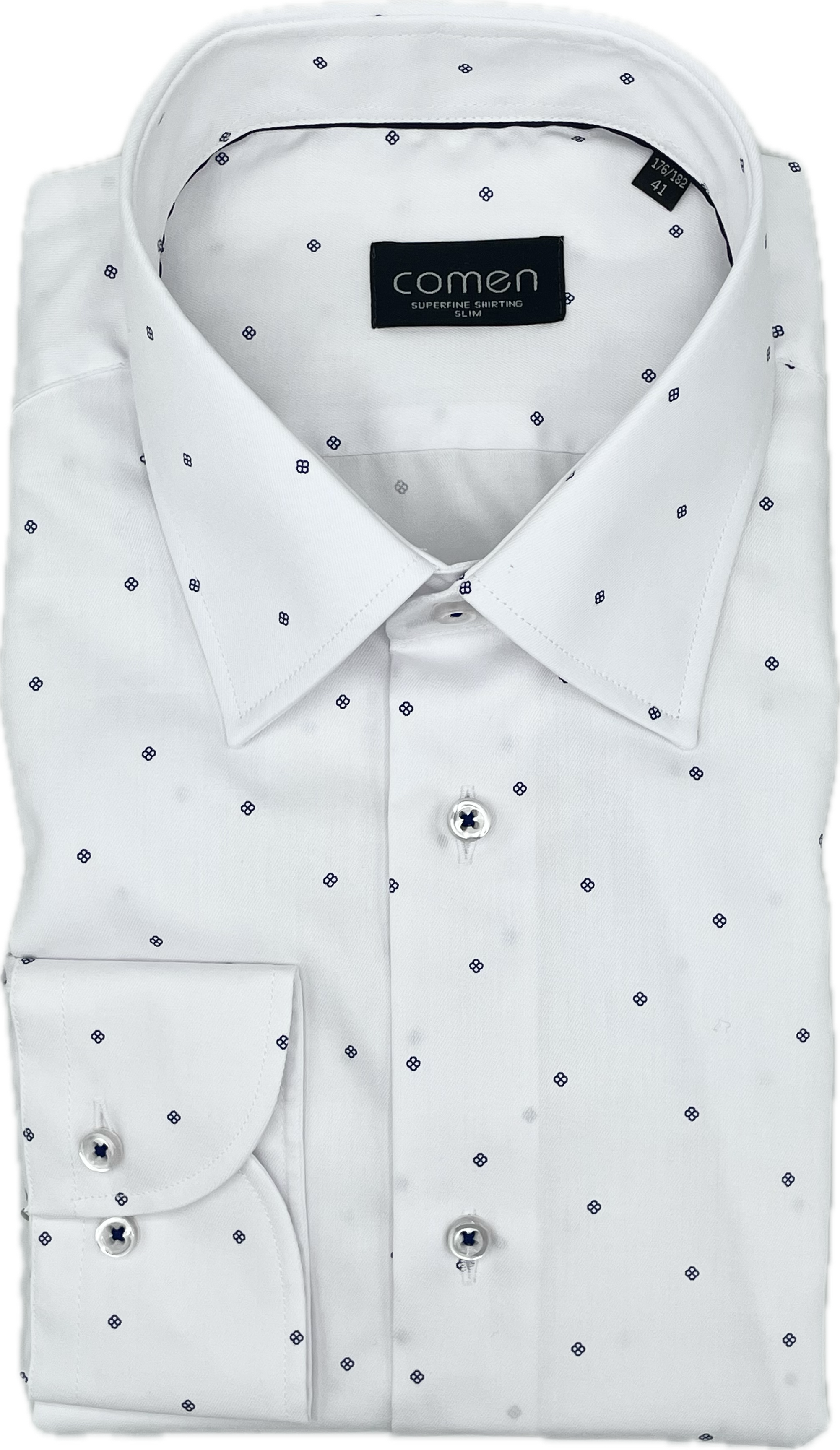 Biała tkanina zdobiona jest subtelnym granatowym wzorem, który nadaje koszuli wyjątkowej klasy, ale bez nadmiernego przepychu. To doskonały wybór zarówno do biura, jak i na mniej formalne spotkania – Malcolm łączy w sobie lekkość, świeżość i ponadczasowy styl.