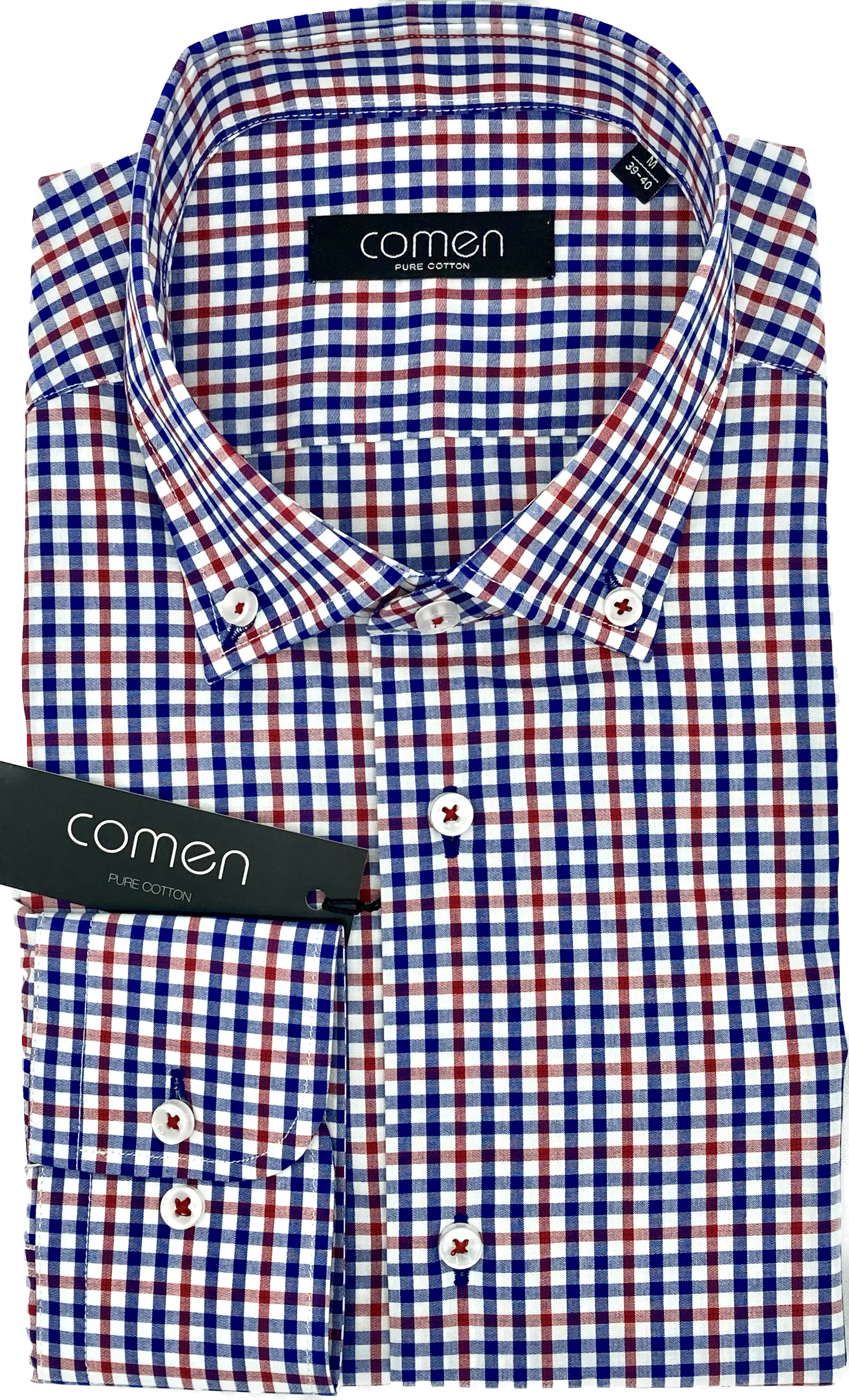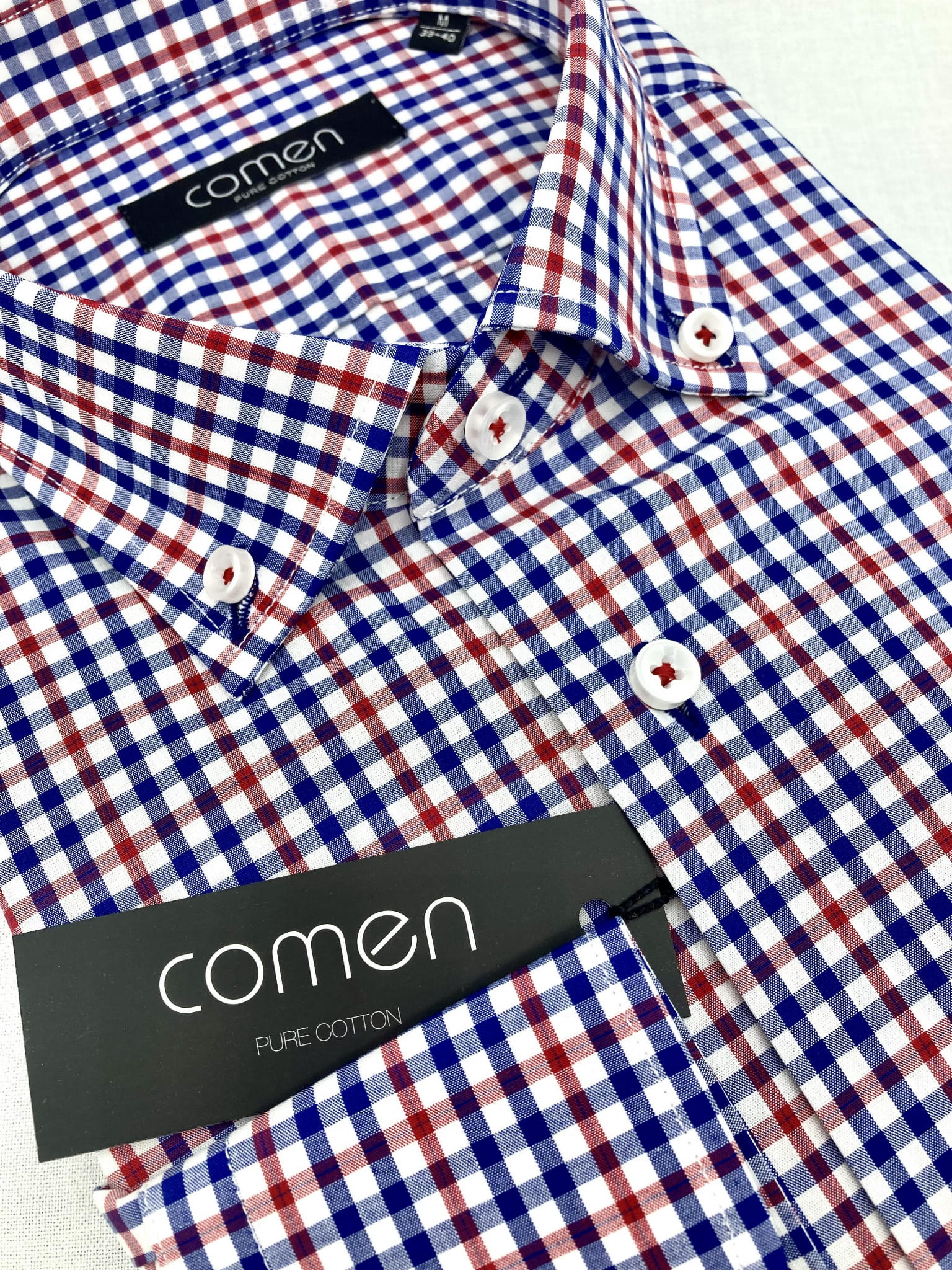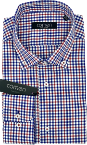 Model koszuli ROGER, ma granatowo-czerwoną kratę na białym tle, co nadaje jej dynamicznego i odważnego charakteru.