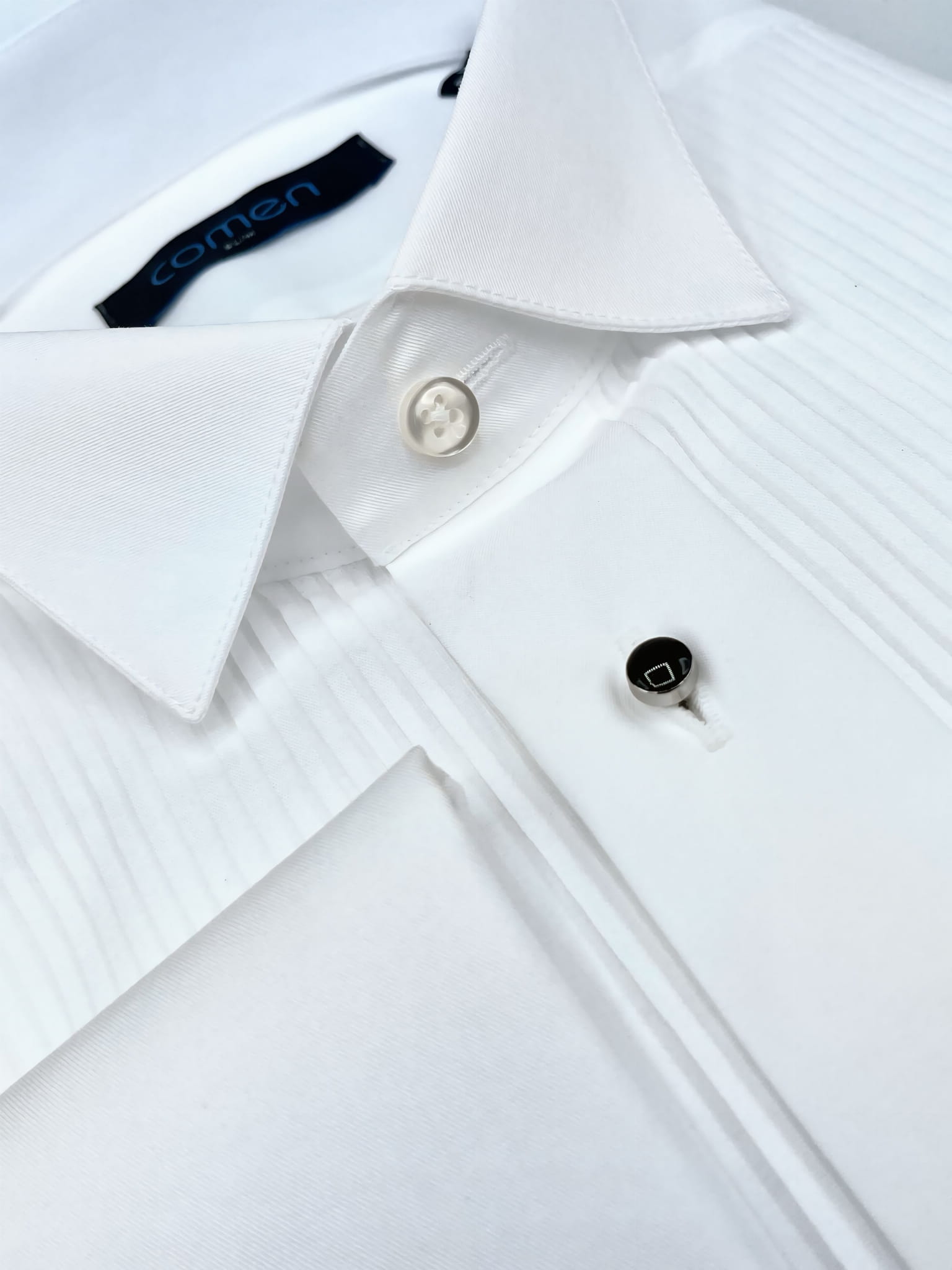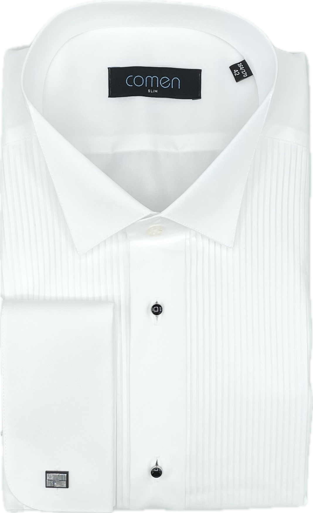 Jej dopasowany krój slim fit idealnie podkreśla sylwetkę, zapewniając nienaganną prezencję. Plisowany przód oraz metalowe, biżuteryjne guziki dodają całości luksusowego charakteru, który zachwyci zarówno Ciebie, jak i otoczenie. Kołnierz łamany został zaprojektowany z myślą o noszeniu muchy, co czyni tę koszulę idealnym wyborem do smokingu.